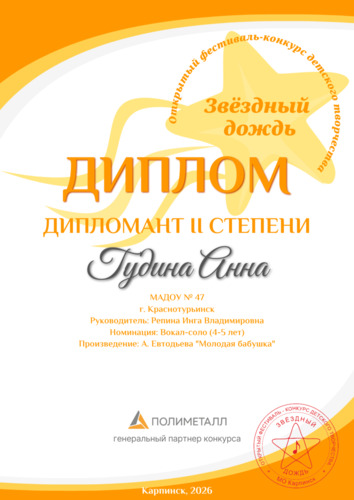 В нашем детском саду зажигаются новые звездочки. Пением с детьми музыкальные руководители занимаются с ясельной группы. И вокальные способности у некоторых детей видны уже в 4 года. Поэтому таким ребятам необходимо дать возможность раскрыть свой талант, поучаствовать в фестивалях и конкурсах города и области. Недавно Аня Гудина, воспитанница средней группы «Вырастай-ка», приняла участие в окружном фестивале-конкурсе детского творчества «Звездный дождь», исполнив песню «Молодая бабушка», и стала дипломантом II степени. А уже на следующей неделе она будет выступать на сцене «Культурно-досугового комплекса» г. Краснотурьинска. Пожелаем Анечке удачного выступления и новых больших побед в будущем! Посмотреть выступление Ани Песня "Молодая бабушка" |